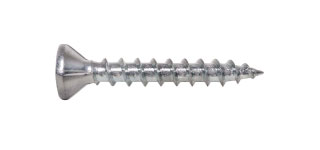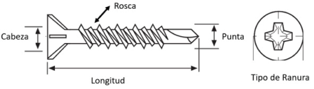 Tornillo Zincado brillante, cabeza de trompeta, punta fina, rosca fina, ranura Phillips #2. Para fijación en placas de Volcanita a estructura de acero galvanizado de espesor 0,5 mm.